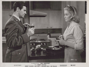 Step back into the thrilling world of 1950s action with this rare vintage photograph featuring May Britt and Richard Egan in The Hunters (1958). Directed by Dick Powell, this gripping adventure film, set during the Korean War, follows a group of fighter pilots on a dangerous mission, blending heart-pounding action with intense drama. May Britt and Richard Egan deliver standout performances that add depth and emotion to this war-time story.