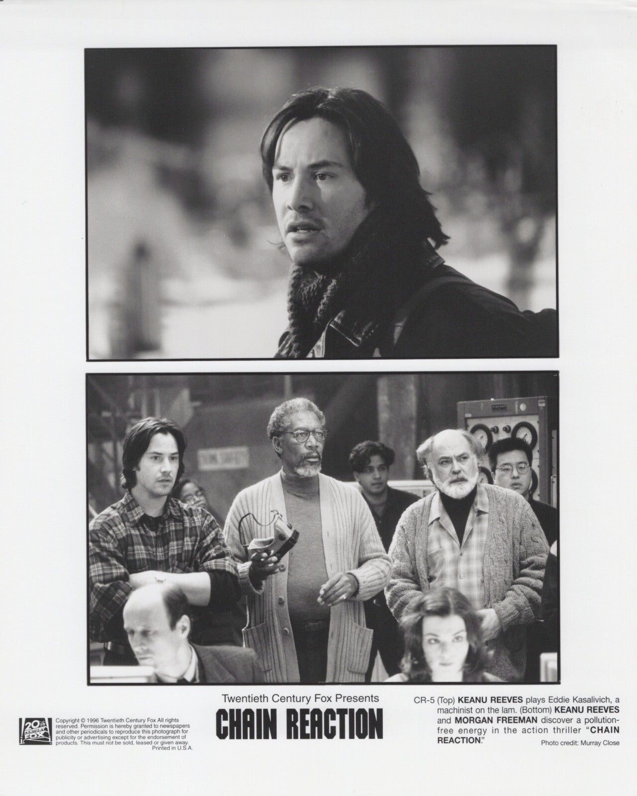 Keywords: Morgan Freeman, Keanu Reeves, Chain Reaction (1996), action-thriller, clean energy conspiracy, suspense, Hollywood, 1990s film.