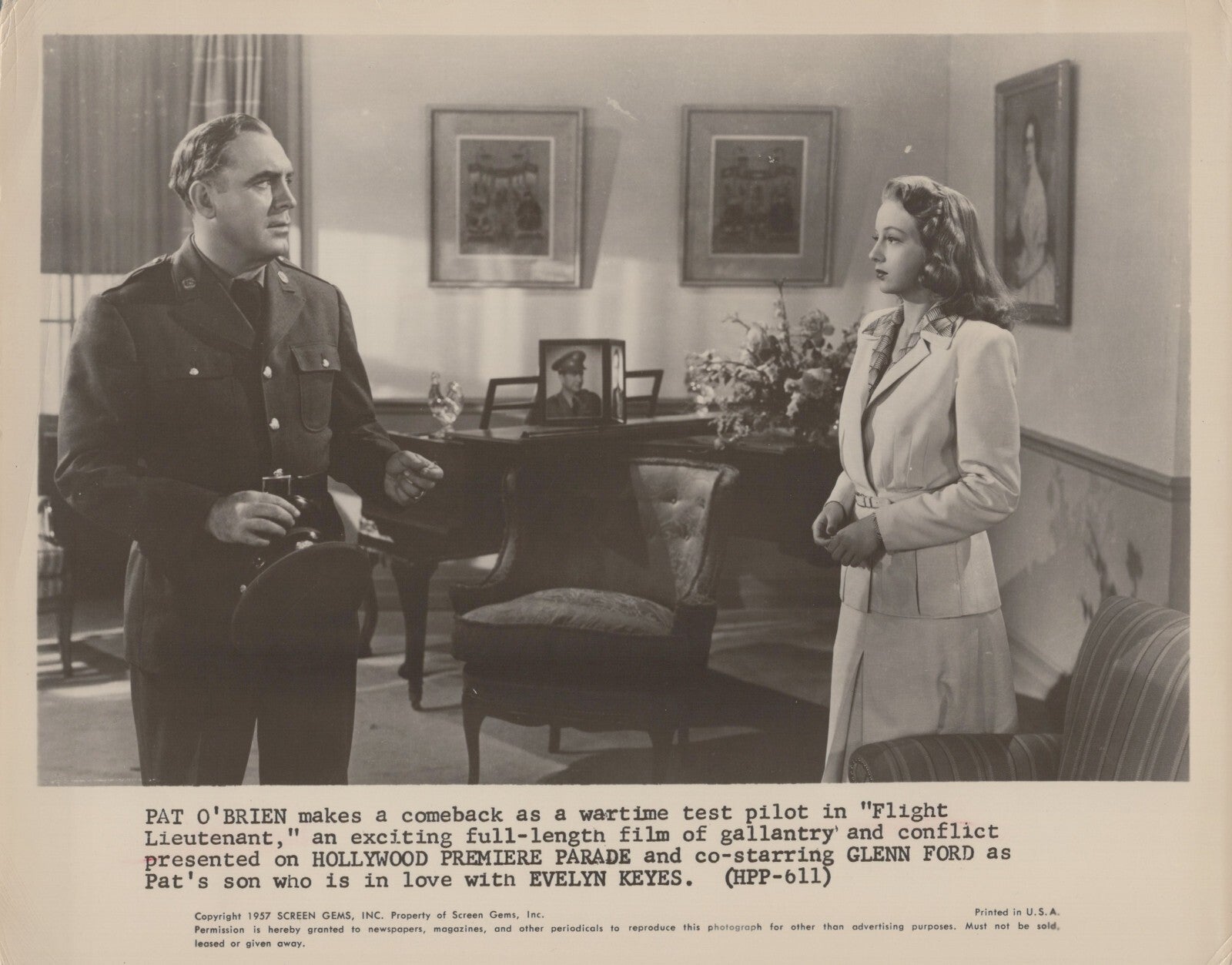 Pat O'Brien Flight Lieutenant photo, Evelyn Keyes WWII movie still, 1942 vintage film photography, classic aviation movie memorabilia, Golden Age Hollywood collectible, Flight Lieutenant movie collectible, vintage war drama photo, rare Pat O'Brien movie memorabilia, WWII-era cinema photograph, Evelyn Keyes Hollywood memorabilia.