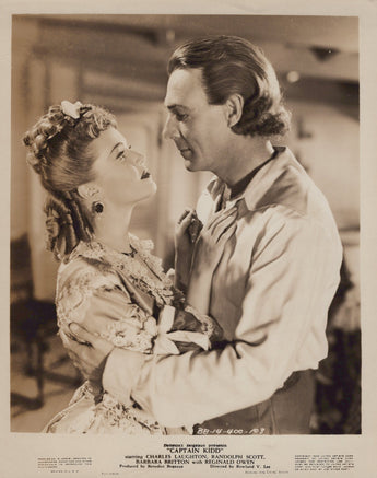 Capture the spirit of high-seas adventure with this vintage 8x10 photograph featuring Randolph Scott and Barbara Britton in Captain Kidd (1945). This swashbuckling tale of treachery and treasure, directed by Rowland V. Lee, also stars Charles Laughton in the titular role as the infamous pirate. Scott’s commanding presence as Adam Mercy and Britton’s captivating charm bring energy and intrigue to this classic action film. This authentic studio still is a prized collectible for fans of pirate adventures and Golden Age Hollywood.