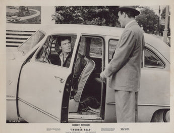 Robert Mitchum photograph, Gene Barry photo, Thunder Road 1958, vintage action-drama memorabilia, moonshine runner films, 1950s Hollywood collectibles, Arthur Ripley direction, cult classic movie photos, rare Robert Mitchum roles, iconic film photography.