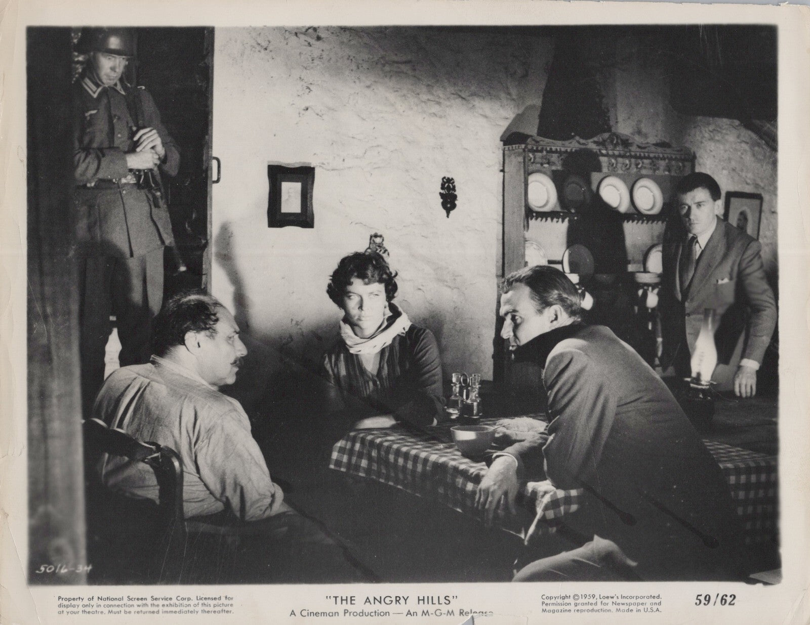 Robert Mitchum photograph, Gia Scala photo, Peter Illing in The Angry Hills, 1959 WWII drama memorabilia, Robert Aldrich films, Nazi-occupied Greece movies, rare war film photography, classic Hollywood collectibles, espionage drama cinema, vintage movie photos.