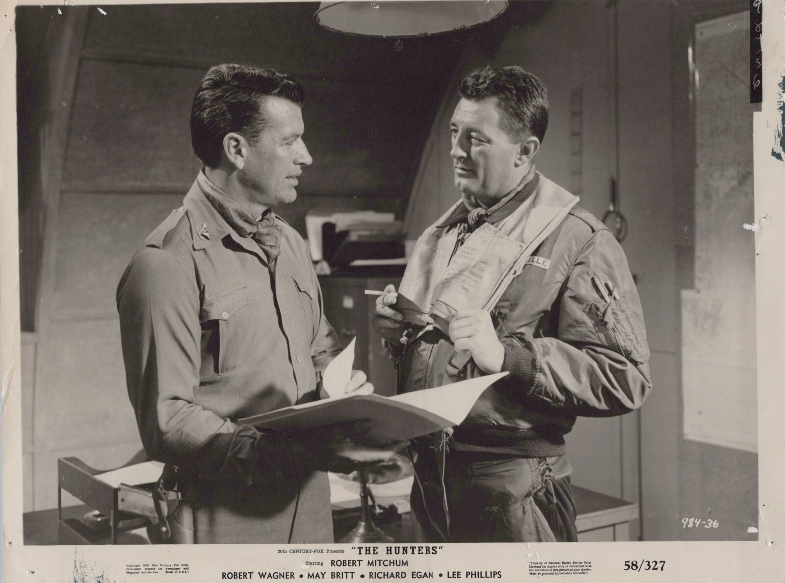 Robert Mitchum photo, Robert Wagner vintage still, The Hunters 1958 memorabilia, classic Cold War adventure film, vintage Hollywood photography, rare action film still, 1950s movie photo, military aviation film collectible, Robert Mitchum collectible, Robert Wagner movie still.