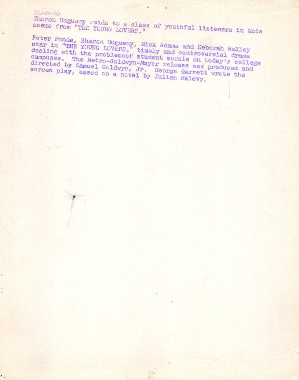 Add this rare and beautiful movie still of Sharon Hugueny in The Young Lovers to your collection—a true gem for lovers of classic Hollywood romance.