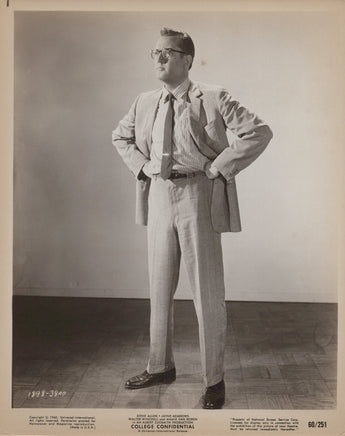 Keywords: Steve Allen, College Confidential (1960), vintage movie photo, classic Hollywood, 1960s drama, rare movie still, collectible film memorabilia, youth culture, controversial cinema, sociology professor role, vintage Steve Allen.