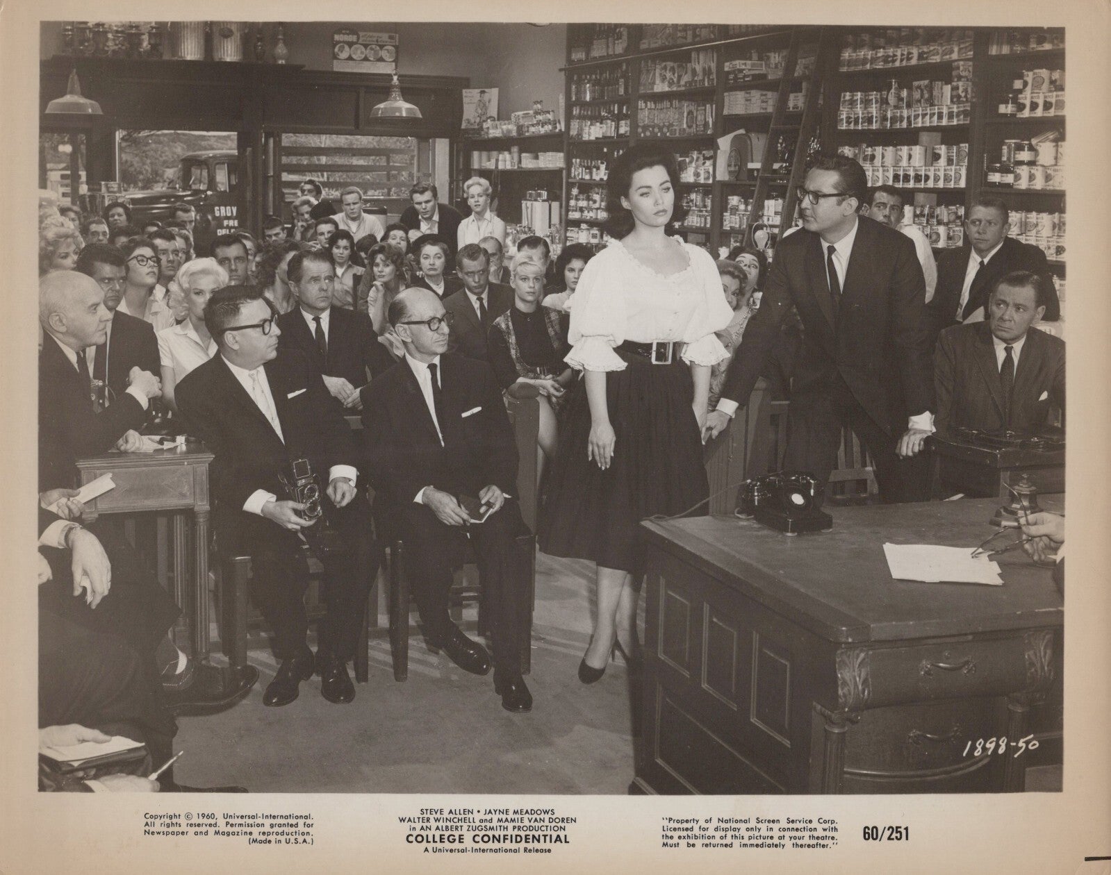 Steve Allen Ziva Rodann College Confidential 1960 original photo, 1960s comedy movie still, vintage film photography, classic Hollywood photograph, Steve Allen memorabilia, Ziva Rodann collectibles, 1960s campus comedy, vintage movie stills, comedy film photography.