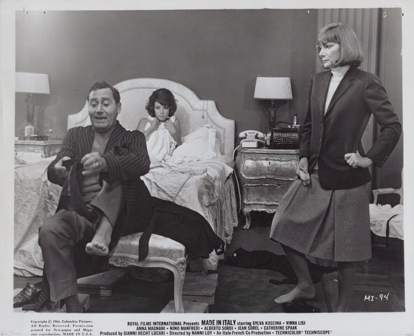 Sylva Koscina, Alberto Sordi, Rossella Falk, Made in Italy 1965, vintage Italian movie photograph, Nanni Loy film, 1960s European cinema, classic Italian film memorabilia, anthology movie collectible, rare Italian cinema photo, Sylva Koscina vintage still, Alberto Sordi collectible, Rossella Falk drama, Italian culture in film, international movie memorabilia.