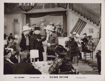 Description: Discover a classic moment from the 1939 Western Six-Gun Rhythm, starring Tex Fletcher and Carl Mathews. Fletcher, known for his rugged cowboy roles, brings his signature charm and action-packed performance to this B-Western film, while Carl Mathews, a seasoned actor in Westerns, adds his distinctive touch to the story. This vintage movie still is a true gem for collectors, capturing two iconic figures of the era in one of their thrilling Western adventures.