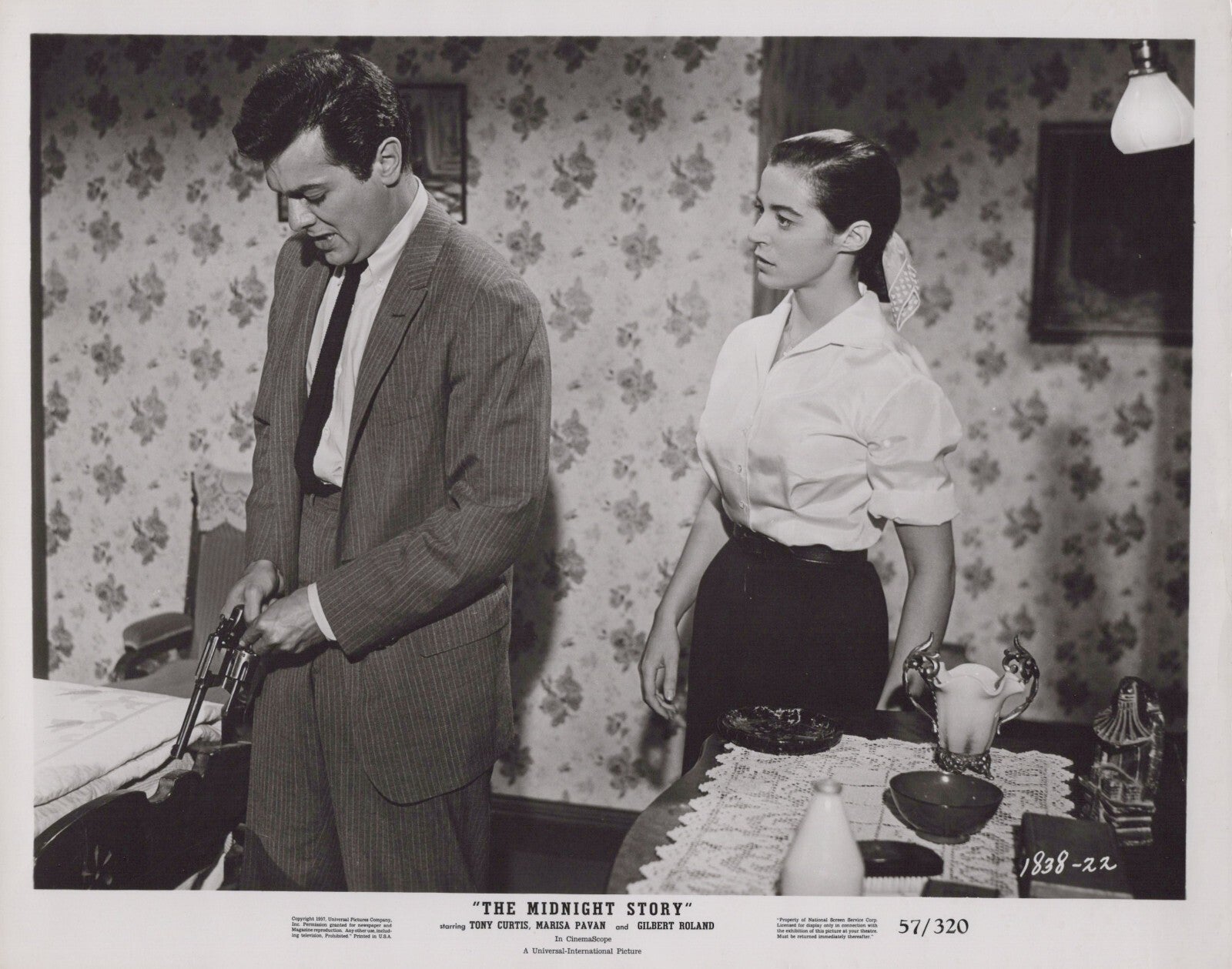 Tony Curtis, Marisa Pavan, The Midnight Story, 1957, vintage movie photograph, film noir, classic Hollywood, rare movie still, Tony Curtis collectible, Marisa Pavan memorabilia, 1950s crime drama, vintage cinema photo.