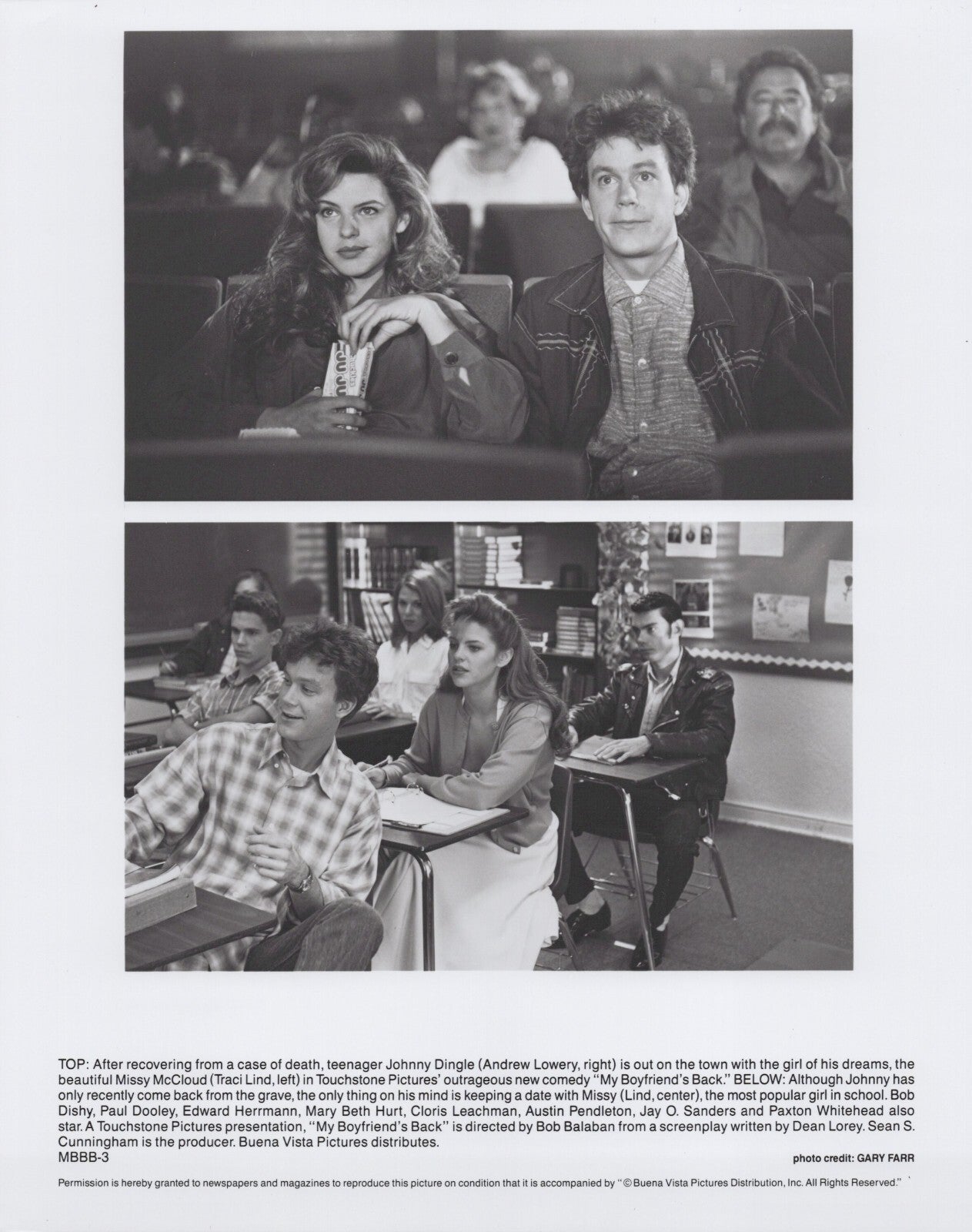 Keywords: Traci Lind, Andrew Lowery, My Boyfriend's Back 1993, romantic horror-comedy, zombie love story, vintage movie photograph, '90s cult film, retro cinema collectible, Bob Balaban film, undead romance.