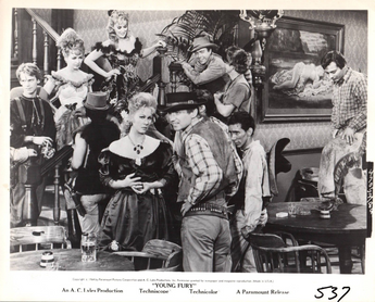 Virginia Mayo Young Fury photo, 1964 Western movie still, vintage Hollywood memorabilia, classic Western film photograph, original Virginia Mayo collectible, rare vintage movie photo, 1960s film memorabilia, action-packed Western collectible, iconic actress portrait.
