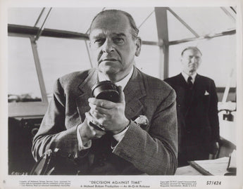 This original vintage photograph features Walter Fitzgerald in a dramatic scene from the 1957 British thriller Decision Against Time. Known for his skilled portrayals of tense and complex characters, Fitzgerald delivers a gripping performance in this film, which centers around a race against time to prevent disaster. The photo captures Fitzgerald in a powerful moment that reflects the film's suspenseful and high-stakes atmosphere.