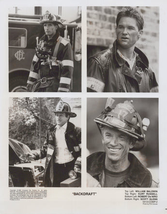 Keywords: Backdraft 1991 movie photo, William Baldwin Kurt Russell Scott Glenn Robert De Niro, action film still, vintage Hollywood photo, original press photograph, 90s drama collectible, Ron Howard film, fire fighting movie collectible.
