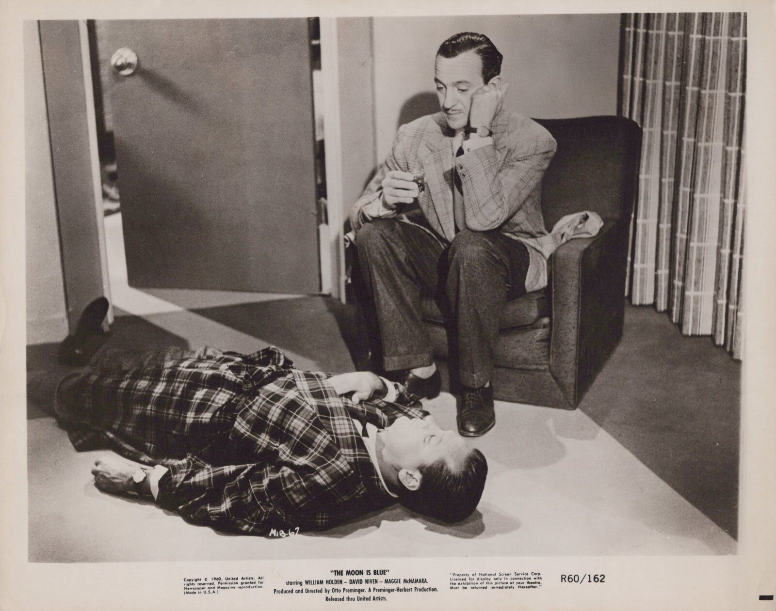 William Holden photo, David Niven movie still, The Moon Is Blue 1953 photograph, Otto Preminger film collectible, vintage romantic comedy memorabilia, 1950s Hollywood photography, William Holden memorabilia, rare David Niven collectible, classic cinema movie still, iconic film collectibles, romantic comedy film photos.