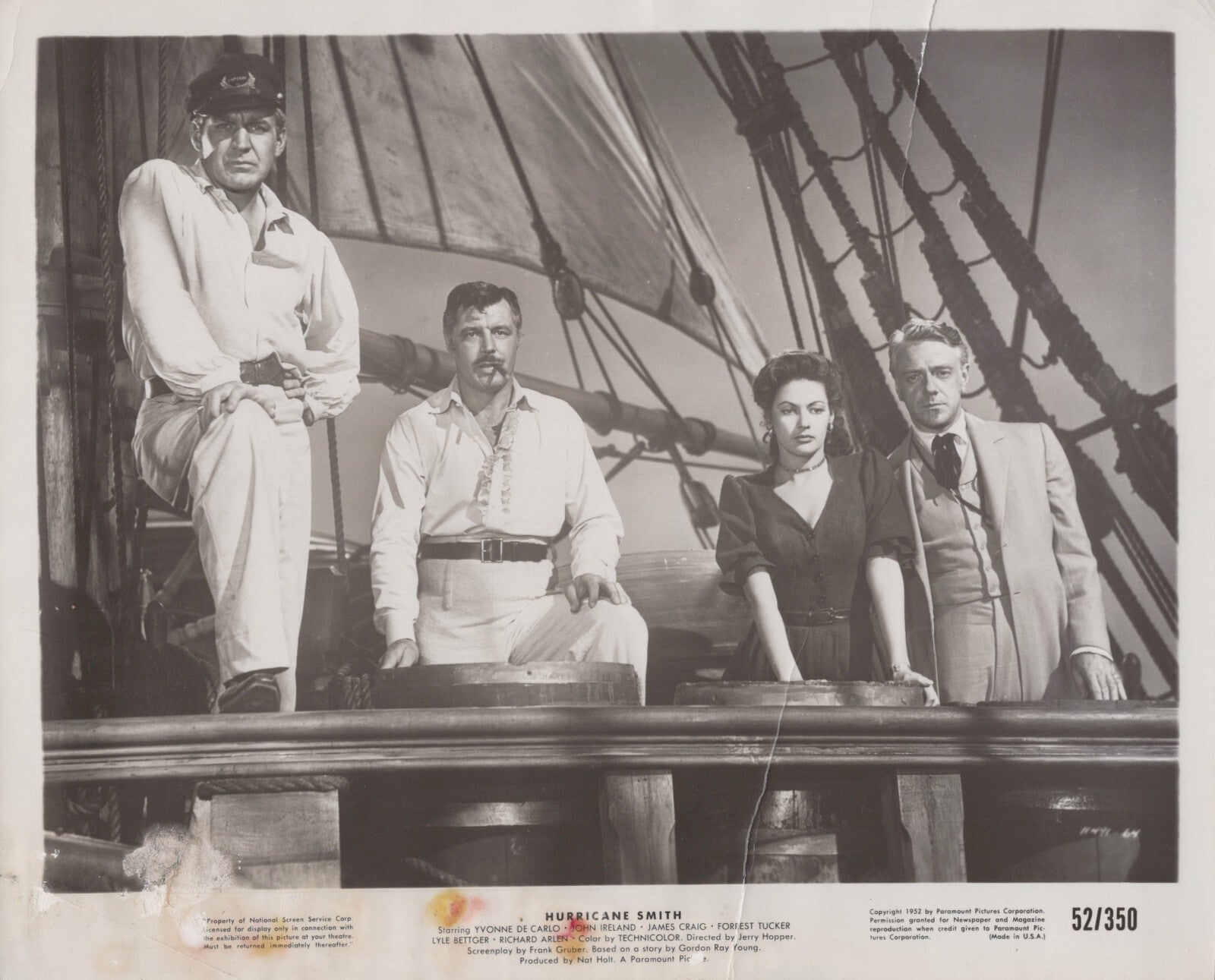 This rare and original vintage movie still features the stunning Yvonne De Carlo, alongside James Craig and Murray Matheson, in a captivating scene from the 1952 action-adventure film Hurricane Smith. Directed by Jerry Hopper, this thrilling movie transports audiences to the exotic South Seas, blending drama, suspense, and romance in a high-stakes tale of treasure, betrayal, and redemption.