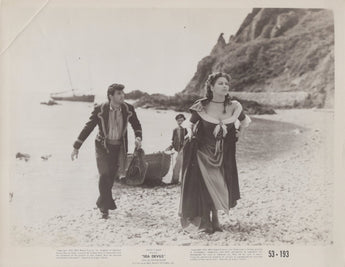 This captivating vintage photograph features Yvonne De Carlo and Rock Hudson in a stunning scene from the 1953 adventure film Sea Devils. Directed by Raoul Walsh, Sea Devils is a swashbuckling maritime adventure set against the backdrop of 17th-century pirates and daring escapades. Rock Hudson stars as the bold and fearless pirate, while Yvonne De Carlo, known for her striking beauty and dramatic presence, plays the romantic lead entangled in a life of adventure and danger.