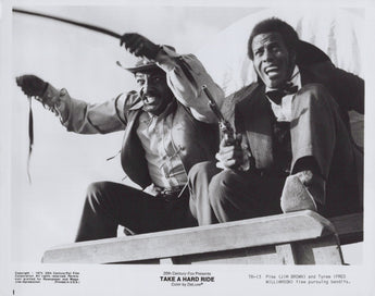 This original 10 x 8 inch black and white gelatin-silver print photograph features Hollywood actors Jim Brown and Fred Williamson in the 1975 movie "Take a Hard Ride". The image is printed on paper and depicts the two men in an action scene. This antique photograph is a licensed original and would make a great addition to any movie or celebrity memorabilia collection. The photo was produced in the United States and would be a perfect gift for fans of the featured actors or the movie itself.