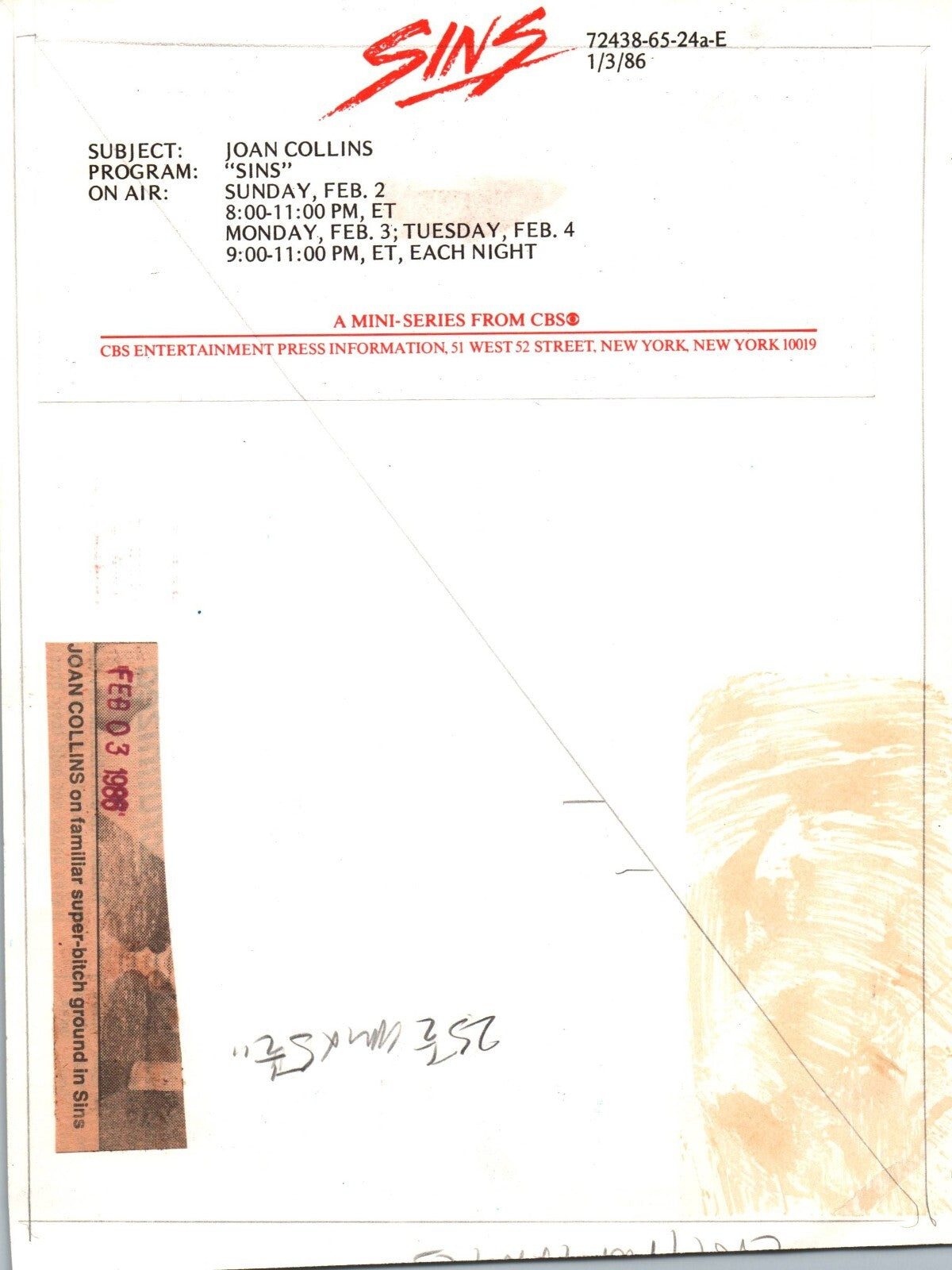 This photo encapsulates the television brilliance and enduring charm of Joan Collins, offering a timeless glimpse into her captivating presence in "Sins" (1986). Whether you're a dedicated collector or a fan of classic TV dramas, this vintage piece adds a touch of sophistication and television history to your collection.