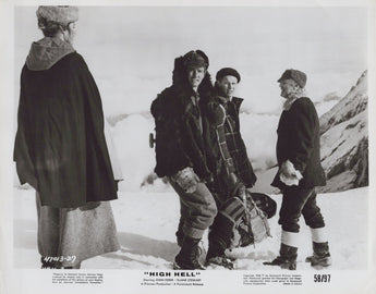 This vintage 1958 photograph captures actors John Derek and Patrick Allen in the Hollywood movie "High Hell." The black and white gelatin-silver print measures 10 x 8 inches and features the two actors in character. The photo is an original production technique and is not a licensed reprint.