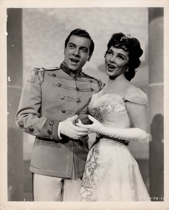 This vintage gelatin-silver print photograph captures Kathryn Grayson and Mario Lanza in the 1949 movie "That Midnight Kiss". The black and white image measures 8 x 10 inches and features the two actors in a scene. The photo is an original production technique and is not a licensed reprint. The actress and actor are dressed in movie costumes, with Grayson holding a bouquet of flowers. This collectible item would make a great addition to any vintage Hollywood or movie memorabilia collection.