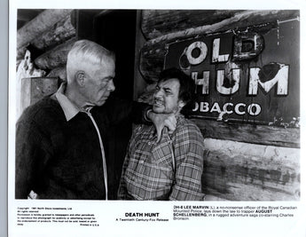 This is an original black and white photograph featuring Lee Marvin and August Schellenberg in the movie Death Hunt (1981). The photo measures 10 x 8 inches and is printed on glossy paper using the gelatin-silver print technique. It is an antique piece from the vintage Hollywood era and would make a great addition to any collection of Hollywood memorabilia. The photo is unframed and comes as a single piece. It is an original production and not a licensed reprint. The photo captures the two actors in a scene from the movie and would be a great gift for fans of Hollywood movies and celebrities.