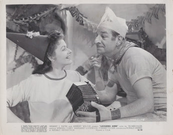 This vintage black and white gelatin-silver print photograph features Margaret Lockwood and Ronald Shiner in the movie Laughing Anne (1953). The 10 x 8 inch paper print is an original piece and would make a great addition to any antique or Hollywood movie memorabilia collection. The photograph depicts the actors in character and captures the essence of the movie, making it a must-have for fans of Margaret Lockwood, Ronald Shiner, and classic Hollywood cinema.