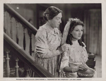 This is a stunning black and white photograph measuring 10 x 8 inches, featuring Hollywood stars Marjorie Main and Jean Parker in the 1938 movie "Romance of the Limberlost". The photograph is an original gelatin-silver print and is a perfect addition to any antique or celebrity photograph collection.