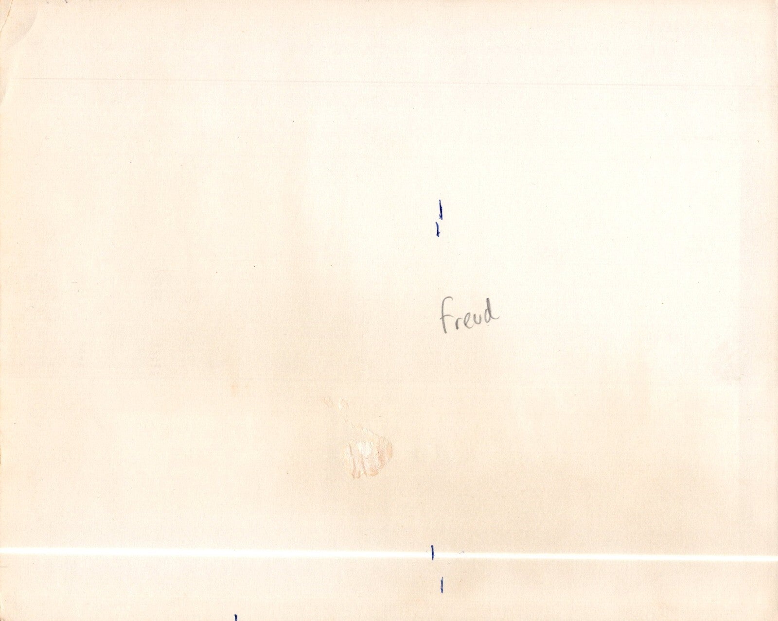 This vintage black and white photograph features Montgomery Clift and Susannah York in the 1963 movie Freud. The image measures 10 x 8 inches and is printed on glossy paper using the gelatin-silver technique. It is an original, licensed print from the United States that portrays the two actors in a scene from the movie.