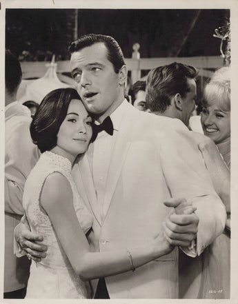 This unique vintage photograph captures Hollywood celebrities Nancy Kwan and Robert Goulet in a stunning portrait. Measuring 8 x 10 inches, this original gelatin-silver print is a must-have for collectors and fans of classic Hollywood. The glossy finish and black & white image of these famous actors and actresses from the 1950s will make a great addition to any room.