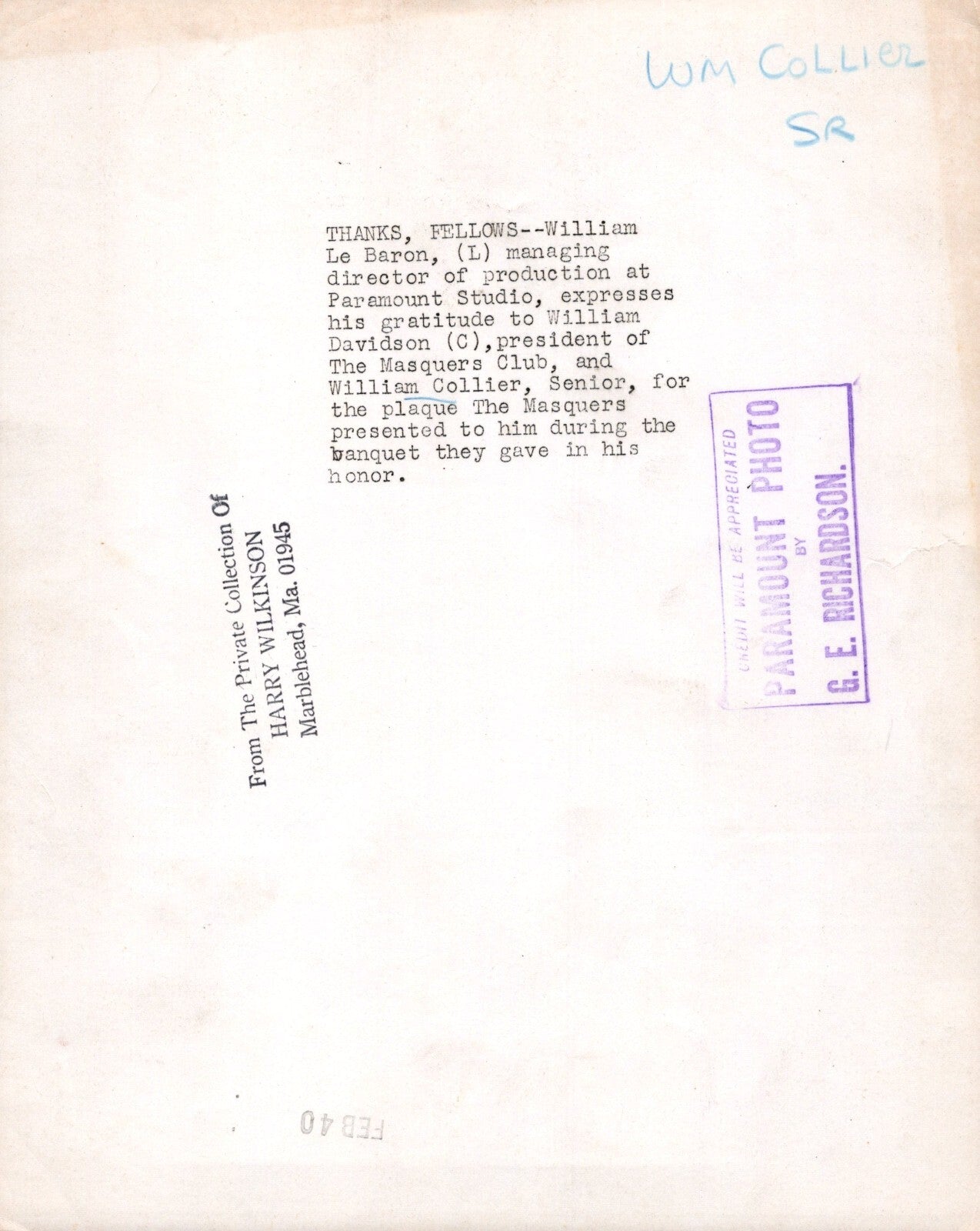 PARAMAUNT STUDIOS WILLIAM LE BARON & WILLIAM COLLIER & DAVISON 1940s Photo Y 413