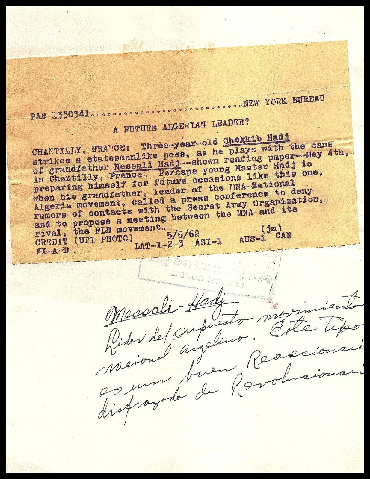 RARE 1962 FUTURE ALGERIAN LEADER MESSALI HADJ CHEKKIB HADJ PORTRAIT PHOTO S1