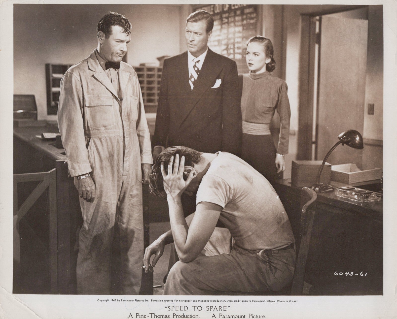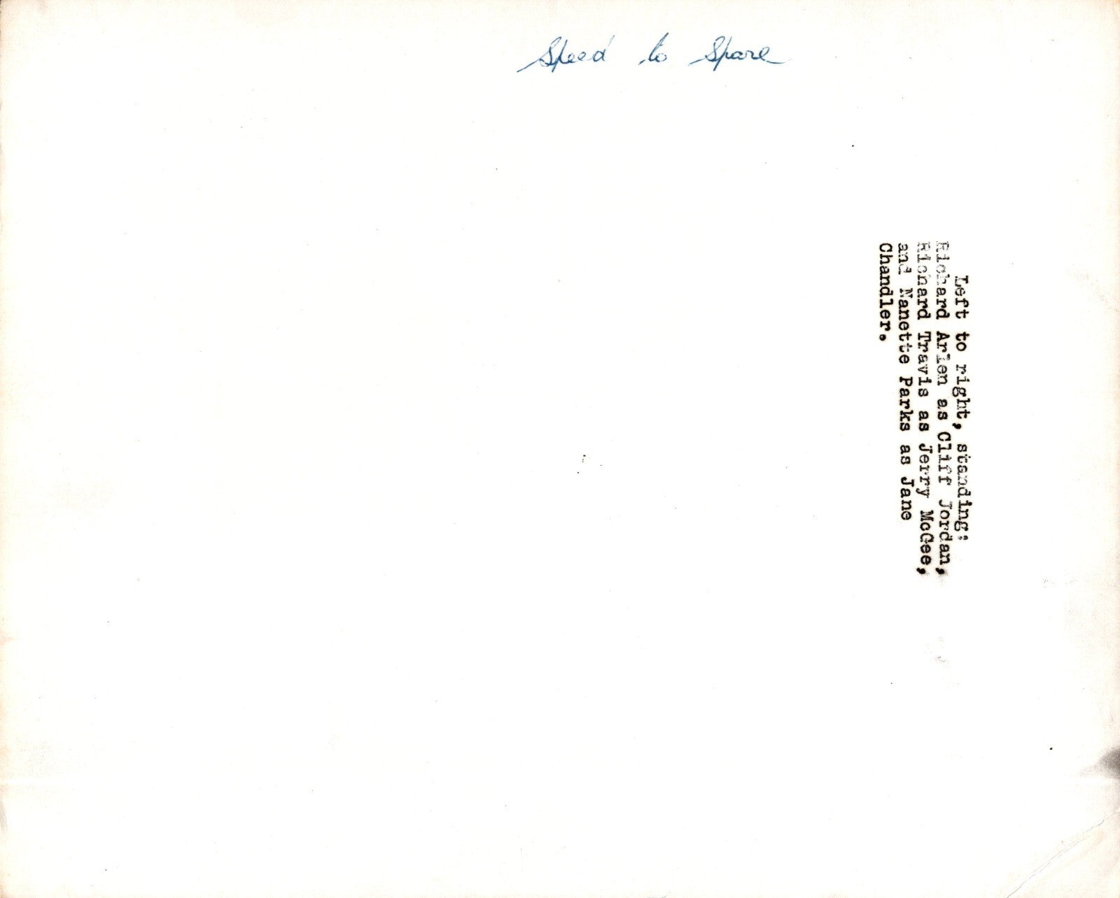 This vintage black and white gelatin-silver print photograph features the talented actors Richard Arlen, Jean Rogers, and Richard Travis in a scene from the 1964 movie "Speed to Spare". The photo measures 10 x 8 inches and is an original, not a reprint.