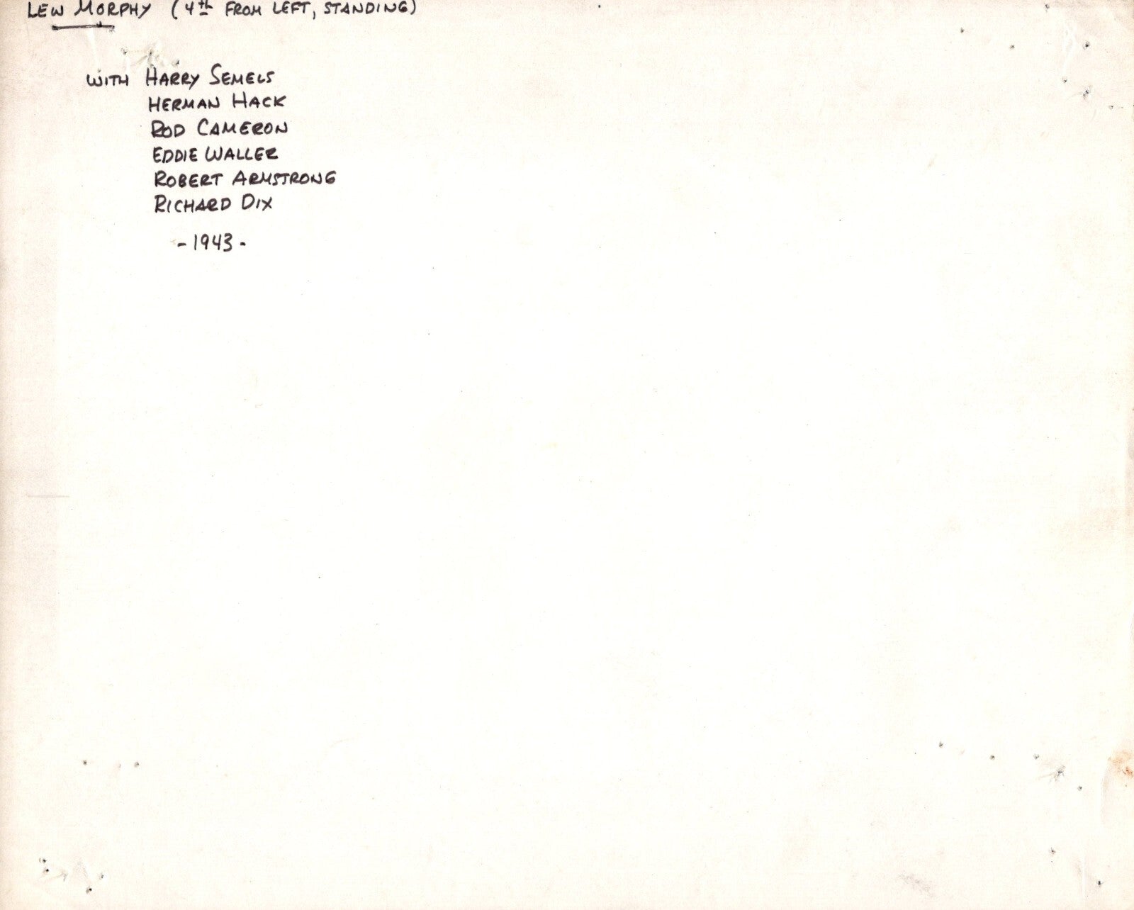This vintage black and white gelatin-silver print photograph showcases Hollywood actors Richard Dix, Robert Armstrong, and Rod Cameron in a scene from the 1943 movie "The Kansan". The photograph measures 10 x 8 inches and is made of paper. It features the three actors in character, with a focus on the women in the background.