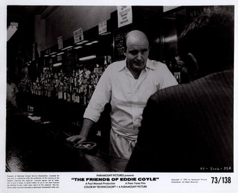 Capture a piece of Hollywood history with this vintage, original gelatin-silver print photograph featuring actors Robert Mitchum and Peter Boyle in "The Friends of Eddie Coyle" (1973). Measuring 10 x 8 inches and printed on glossy paper, this black and white image showcases the iconic duo in a scene from the classic crime drama. The photo is unframed and depicts Mitchum and Boyle in character as they bring the story to life. As a collectible item, this photograph is sure to appeal to fans of Hollywood, celebrities, and movies.