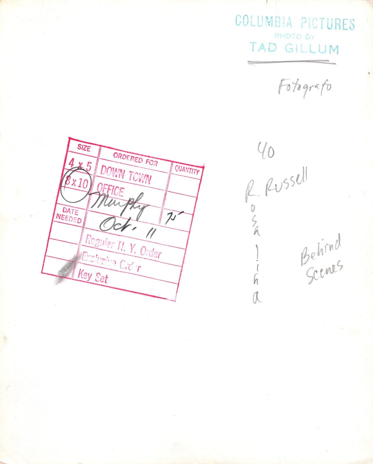 This rare photograph is ideal for fans of Rosalind Russell, collectors of classic cinema memorabilia, or those seeking a one-of-a-kind piece from behind the scenes of Hollywood history.