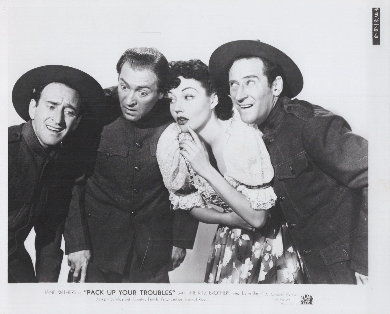 - 📸 Authentic vintage film photo showcasing The Ritz Brothers and Lynn Bari in the iconic "Pack Up Your Troubles."