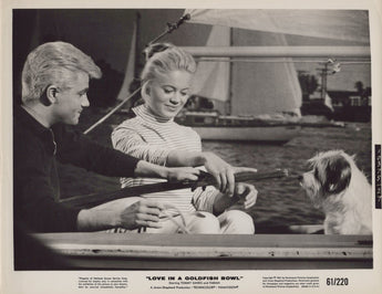 This captivating 10 x 8 inch black and white gelatin-silver print photograph features the talented Toby Michaels and Tommy Sands in the Hollywood movie classic Love in a Goldfish Bowl (1961). The image showcases the stunning actors portraying their roles in an unforgettable scene that captures the essence of the film's theme of love and romance. This original print is a must-have for any collector of vintage Hollywood memorabilia and is sure to be a conversation starter in any setting. Whether you're a fan of classic movies, celebrities, or simply appreciate the beauty of vintage photography, this piece is sure to impress.