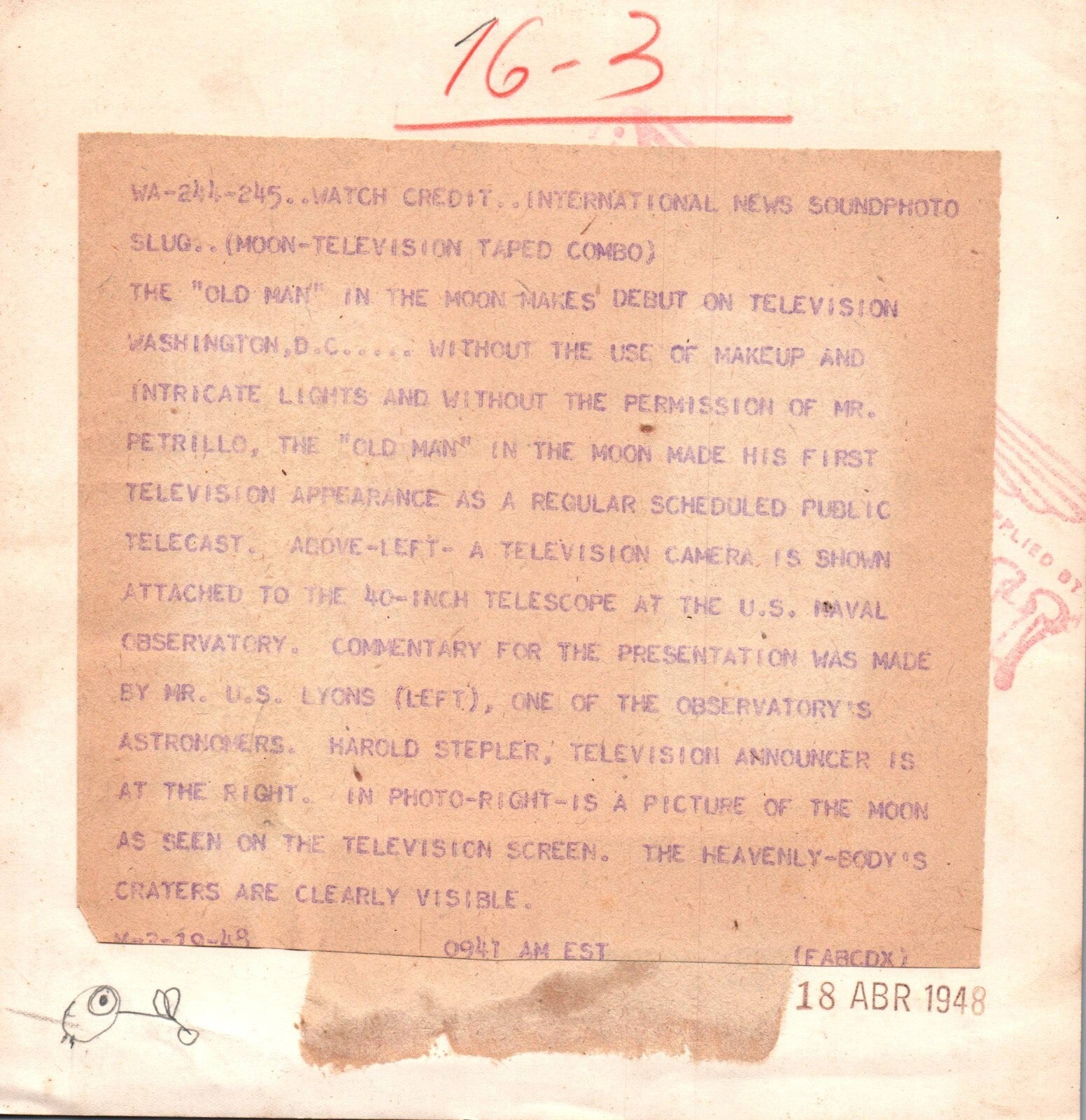 US NASA OLD MAN MOON TELEVISION TAPED COMBO 1948 ORIG PRESS PHOTO 873