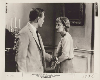 This black and white 10 x 8 inch photograph features Hollywood actors Yul Brynner and Joanne Woodward in a scene from the 1959 movie The Sound and the Fury. The gelatin-silver print was produced in the United States and is an original, licensed reprint. The photo showcases Brynner and Woodward, both acclaimed performers, in a moment of cinematic history. The image, printed on paper, depicts the two stars in character, adding to the collectible value of this antique photograph. The photograph would make a great addition to any movie or celebrity memorabilia collection.