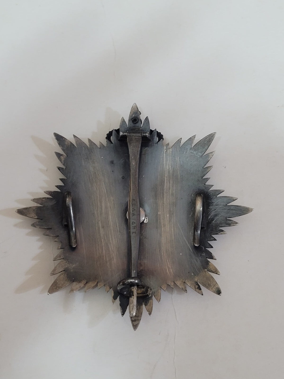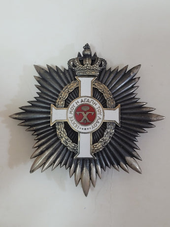 Royal Order of George I Star of Grand Cross Medal. The order was founded in 1915 by King Constantine I in honor of his father, George I. It was only the second Greek order to be created after the Order of the Redeemer in 1833, and remained the second senior award of the Greek state for the duration of its existence. The order was closely associated with the Greek monarchy, and was hence abolished with the establishment of the Second Hellenic Republic in 1924, to be replaced with the Order of the Phoenix. The order was restored along with the monarchy in 1935, and continued to be awarded until the final abolition of the monarchy in 1973. It was replaced by the Third Hellenic Republic in 1975 by the Order of Honour. The badge of the Order is a white-enameled Latin cross pattée, in silver for the Silver Cross class, in gold for the higher classes, with a wreath of laurels between the arms of the cross. The obverse central disc was in red enamel, bearing the royal cypher of George I, two crossed gammas with a crown above and a "I" below, surrounded by a white enamel ring bearing the royal motto ("The Love of My People is My Strength"). The reverse central disc bears the years of George I's reign, 1863-1913. The badge is topped by a crown; the military division also had crossed swords behind the badge. The Commemorative Medal's badge is identical in design, except that the cross is not enameled. The star of the order is a silver star with straight rays, with eight points for Grand Cross and four points for Grand Commander, and with the obverse of the badge superimposed upon it. The ribbon of the Order is plain crimson red. Tests as Sterling. Approx. Net Weight: 100.2gr Keywords: Vintage, Antique; Ref: BD1433Dimensions: 3.25in x 3.25inMedium: Sterling Silver EnamelCondition: This piece is in great condition with signs of wear commensurate with age. Please see photos for details