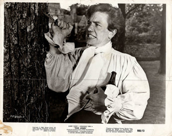 This vintage Hollywood photo features Albert Finney in his iconic role as Tom Jones. The black and white photograph measures 10 x 8 inches and is a licensed reprint. It is unframed and printed on paper, with a gelatin-silver print technique.