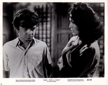 This vintage photograph captures BarBara Luna and Rafael López during the filming of Dime with a Halo in 1963. The black and white image measures 10 x 8 inches and is an original print. It features the Hollywood actors in a scene from the movie, with Luna and López both looking stunning in their roles.