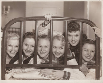 This vintage photograph captures the beauty of girls in collegiate in 1935. The black and white image measures 10 x 8 inches and is an original gelatin-silver print. The photograph features a stunning unknown actress, adding to its Hollywood collectible value. The image is unframed and is a single piece. It is a perfect addition to any collection of Hollywood memorabilia, celebrity memorabilia, or vintage photographs. The photograph was produced in the United States and is a glossy finish. It is a great opportunity to own a piece of Hollywood history.