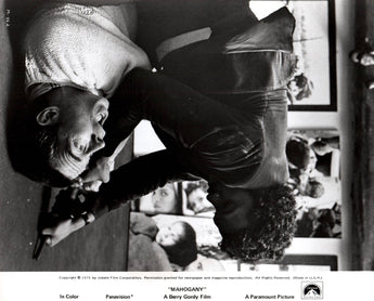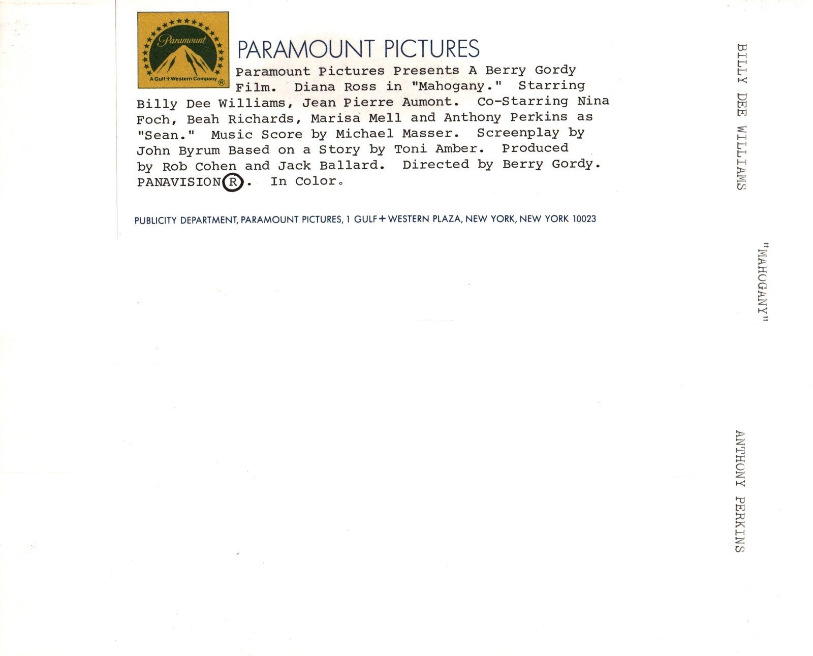 This vintage photograph features Billy Dee Williams and Anthony Perkins in the 1975 movie Mahogany. The black and white image measures 10 x 8 inches and is an original gelatin-silver print. The glossy finish gives it a classic Hollywood feel and the unframed framing option allows for customization to the buyer's preference. The photograph celebrates the iconic actors and their contribution to the movie industry. It is a great addition to any collection of Hollywood memorabilia and a must-have for fans of the movie. Purchase this antique photograph today and own a piece of cinematic history.