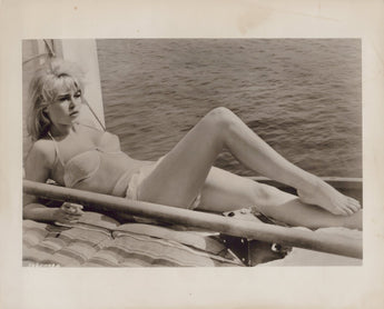 This vintage photograph captures the timeless beauty of Brigitte Bardot during her Hollywood heyday. The image is printed on paper in black and white, and measures 10 x 8 inches. The actress is depicted in a sensual and leggy pose, exuding the glamour and allure that made her a beloved movie star.