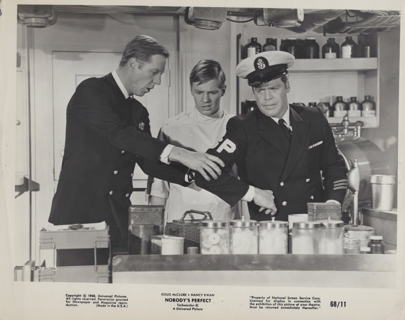 Add a dash of 1960s comedy charm to your collection with this vintage photograph featuring David Hartman and Doug McClure from the 1968 film Nobody's Perfect. Known for its lighthearted humor and delightful performances, Nobody’s Perfect follows the comedic mishaps of two Navy men navigating hilarious situations. This rare photo captures the chemistry and comedic timing between Hartman and McClure, making it a fantastic collectible for fans of classic comedies.