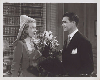 This vintage photograph captures actors Don Castle and Peggy Knudsen in the 1947 movie "Roses Are Red." The black and white image measures 10 x 8 inches and is an original gelatin-silver print. It features the two actors in character and is a great addition to any collection of Hollywood memorabilia or vintage photographs.
