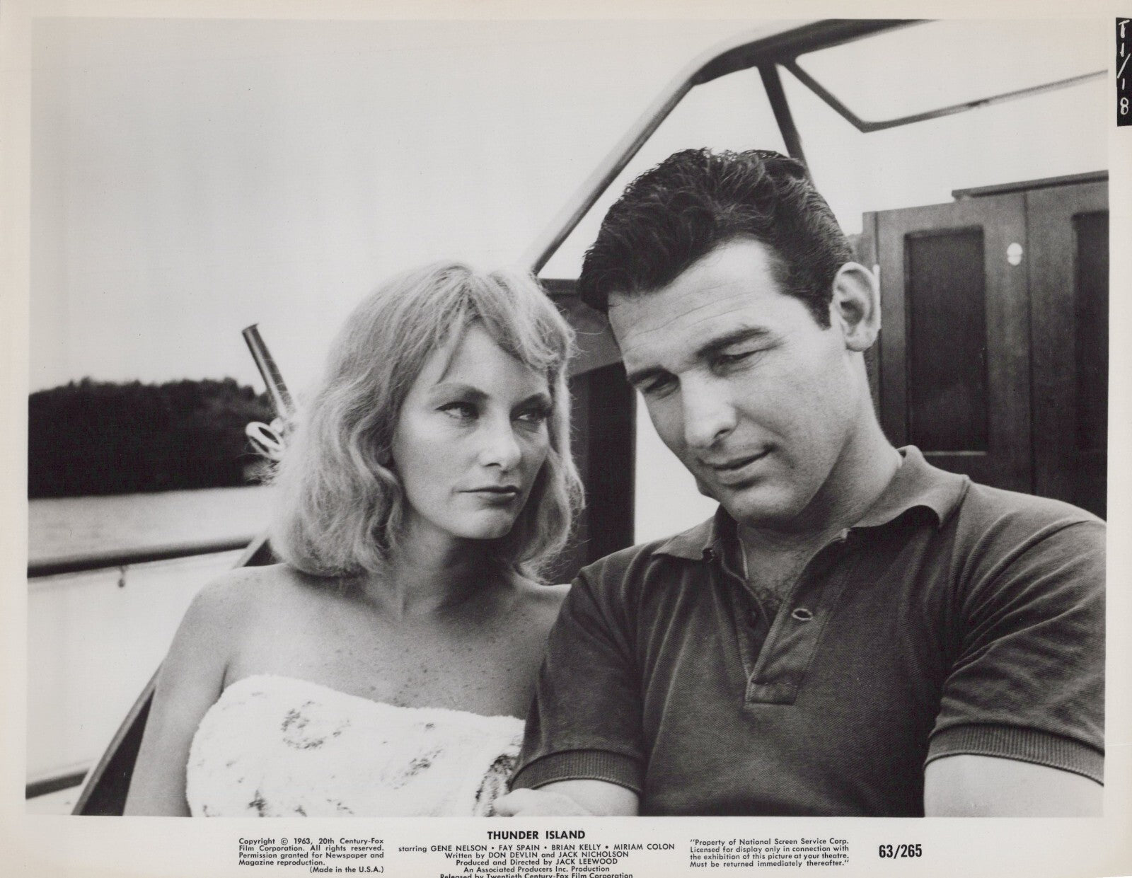 This vintage photograph features actress Fay Spain and actor Gene Nelson in their roles in the 1963 movie "Thunder Island". The black and white image is printed on glossy paper in original gelatin-silver quality. The photograph is unframed and measures 8 x 10 inches in size.