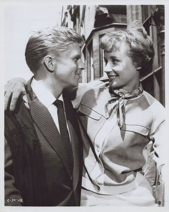 This vintage photograph captures two Hollywood celebrities, Hardy Krüger and Micheline Presle, in a still from the movie Blind Date (1959). The black and white gelatin-silver print measures 8 x 10 inches and is made of paper. The image features the actors in a captivating pose, adding to the charm of this original print. The photograph is an antique piece that belongs to the collectibles category of photographic images. It showcases the production technique and theme of Hollywood movies and celebrities. The featured persons in the image are the renowned actors Hardy Krüger and Micheline Presle. This original print is a licensed reprint from the United States and is perfect for movie enthusiasts and collectors alike.