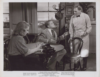 This is a stunning vintage photograph from 1948 featuring actors James Cagney, William Bendix, and actress Jeanne Cagney. The black and white image is printed on high quality glossy paper using the gelatin-silver technique, and measures 10 x 8 inches. It is a single piece unit of sale, and is an original print, not a licensed reprint.